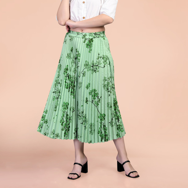 Women Floral Print Pleated Green Skirt