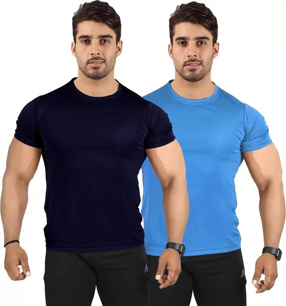 Men Solid Round Neck Polyester Light Blue, Navy Blue T-...