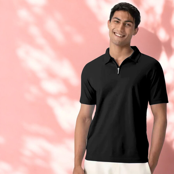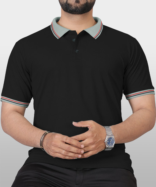 Men Solid Polo Neck Polyester Black T-Shirt
