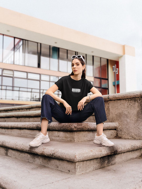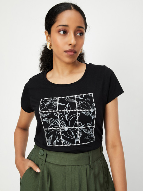 Women Printed Round Neck Pure Cotton Black T-Shirt