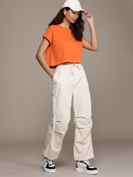 Women Solid Round Neck Cotton Blend Orange T-Shirt