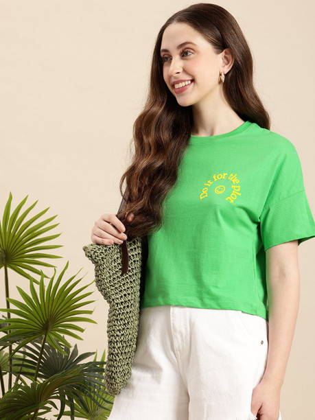 Women Printed Round Neck Pure Cotton Green T-Shirt